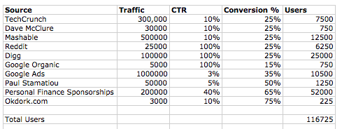 He took his end goal (100,000 users) then broke it down by making assumptions about where they would come from.