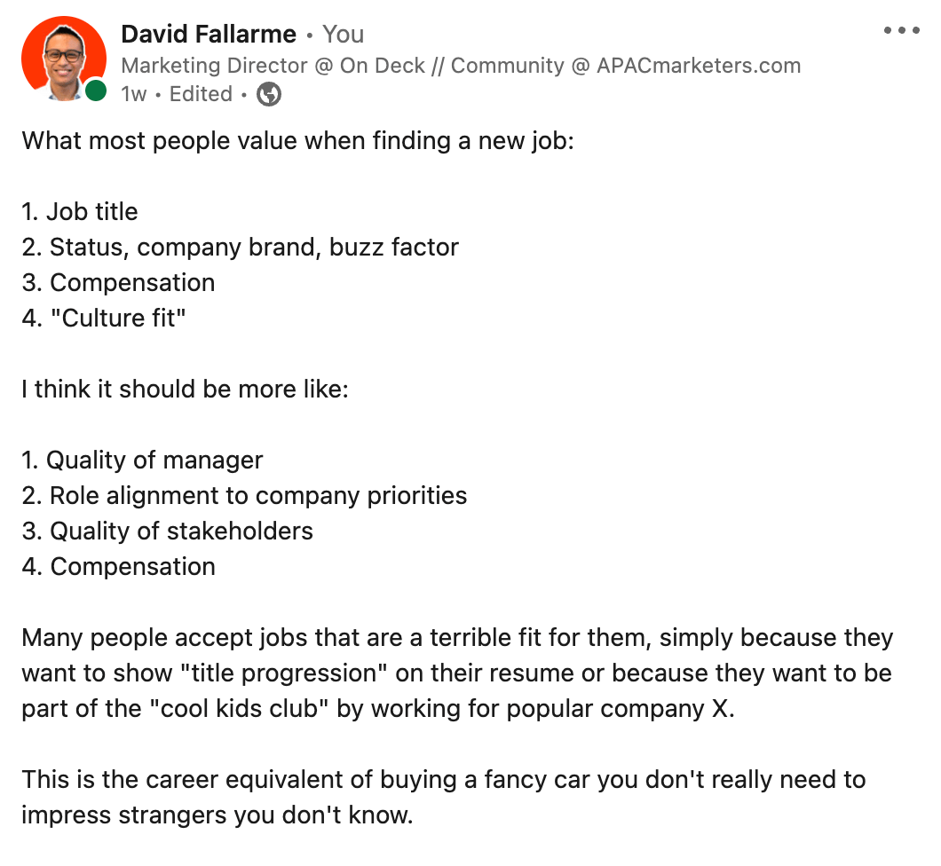 I know it's weird advice to tell people that they should turn down a job offer if they just got laid off. Or to think twice about that role that's going to give them a 30% boost on their salary and a significant title bump.